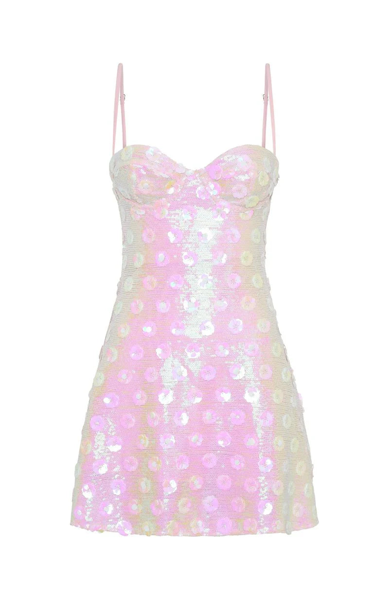 Weekend dress code: Party! The Radiant Soul Sequin Mini Dress in Baby Pink features thin adjustable straps, a sweet‑heart neckline, under‑wire bust cups, a flattering A‑line silhouette, floral‑design sequin embellishments, fully lined construction, and a back zipper with hook‑and‑eye closure. Style it with heels and layered gold jewellery for maximum impact.